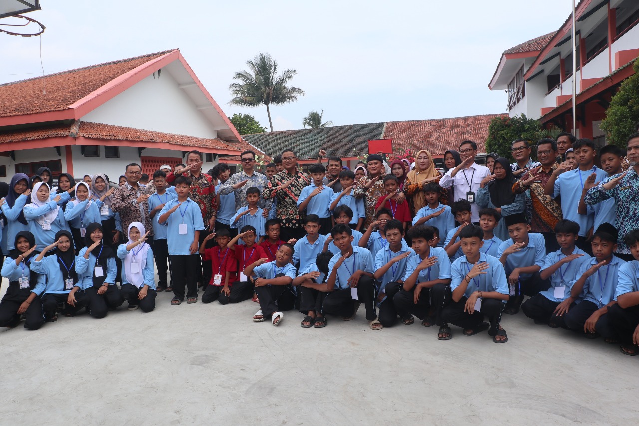 Turut hadir Wakil Bupati Kuningan, Tuti Andriani, S.H., M.Kn., Pj. Sekretaris Daerah, Dr. Wahyu Hidayah, M.Si., jajaran perangkat daerah, di antaranya Kepala Dinas Pendidikan dan Kebudayaan, Uu Kusmana, S.Sos., M.Si., Kepala Dinas Sosial, Toto Toharudin, M.Pd., M.H., perwakilan dari Kementerian Sosial RI, orang tua siswa dan undangan lainnya.